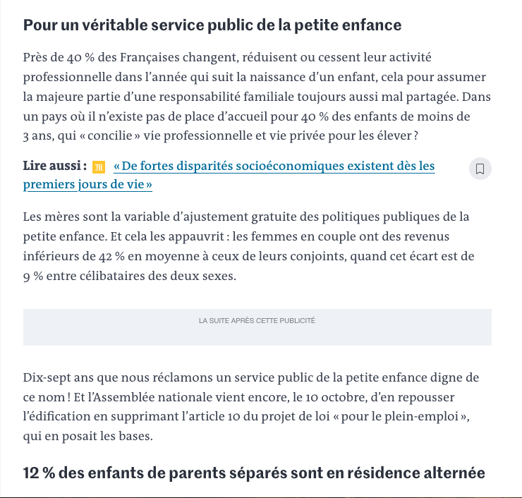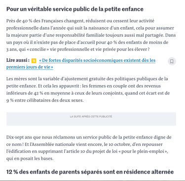 On continue ainsi de présenter comme "universelles" des allocations familiales accordées aux seules familles ayant au moins deux enfants. Et ce n'est là que l'arbre symbolique, en ce qu'il représente les desseins natalistes qui président aux politiques familiales, qui cache la forêt des inégalités familiales. Elles ont des effets socio-économiques désastreux pour les femmes.