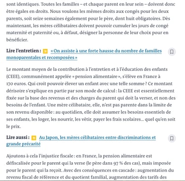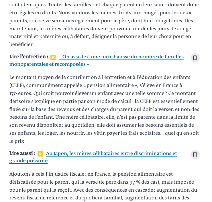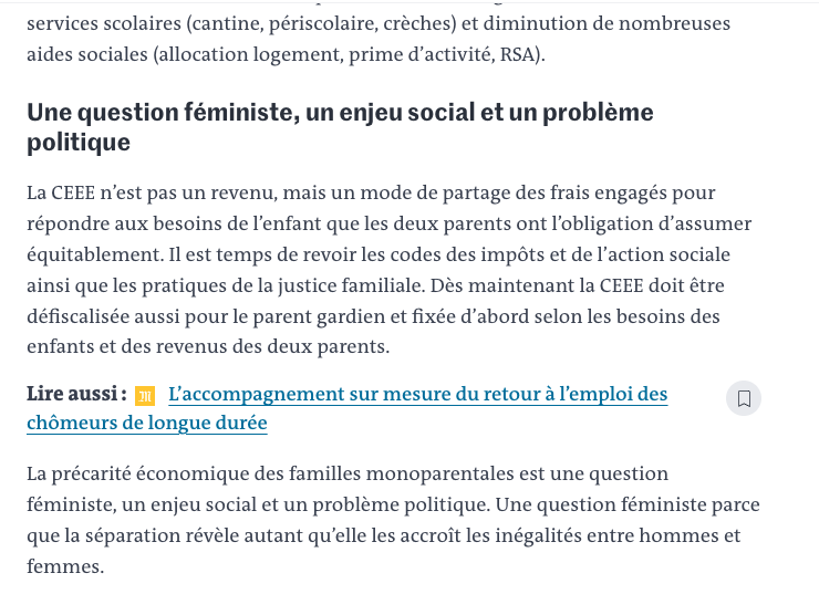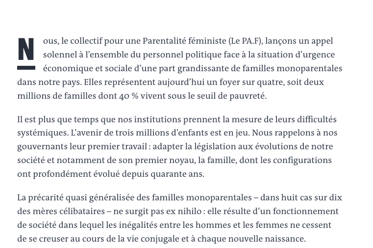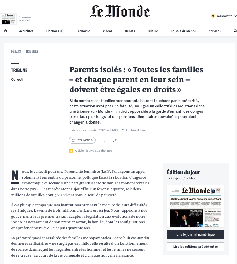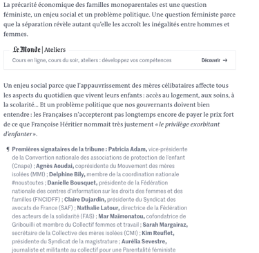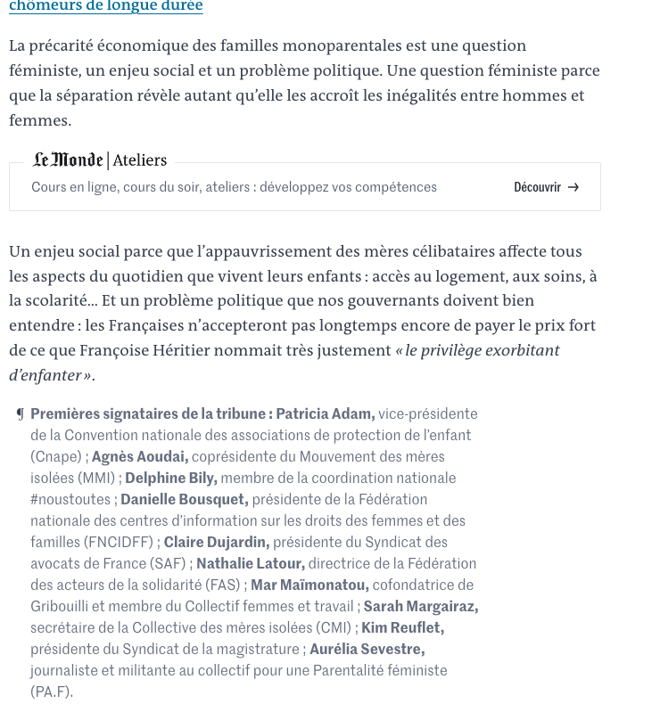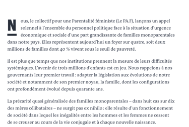 Plus largement, nous nous associons à toutes les associations – de défense des droits des femmes et des enfants, de mères isolées, de parentalité féministe, de familles LGBTQIA+… – qui œuvrent déjà et de longue date en faveur de l’égalité familiale. Pour dresser un revendicatif commun et porter, ensemble, une grande loi sur la famille du XXIe siècle.